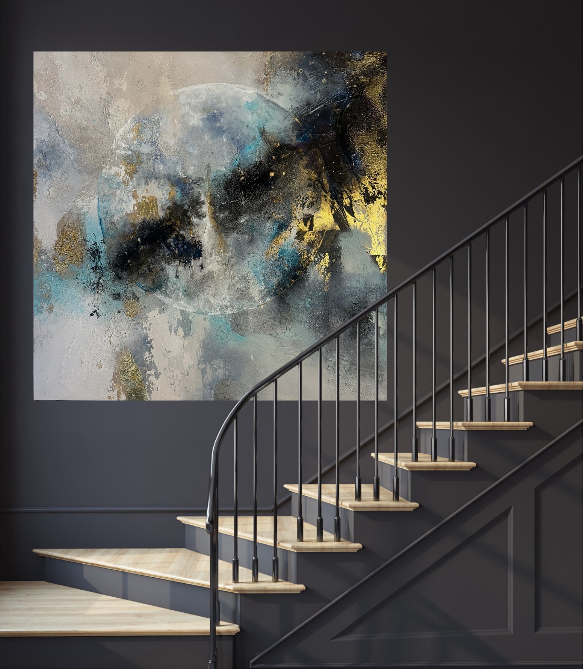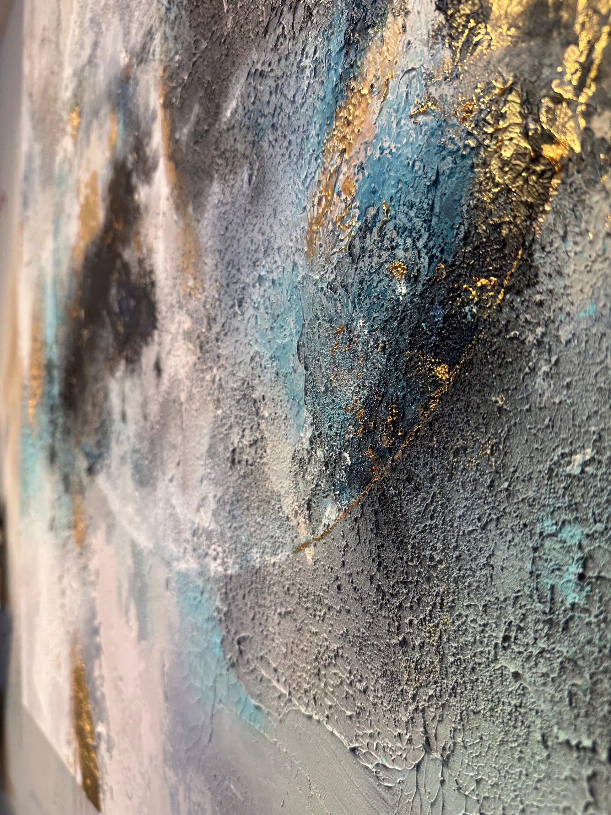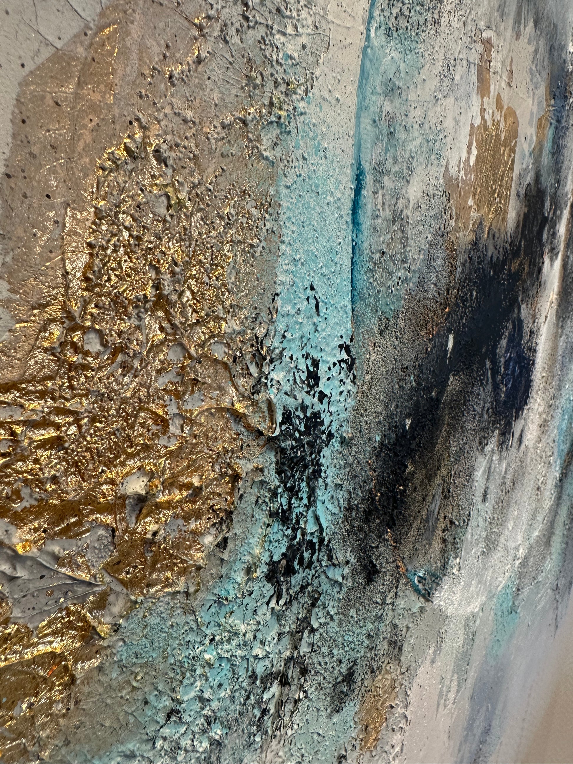 From a distance the piece feels calm and spacious — yet up close it reveals a world of raw textures, shimmering gold and subtle shifts of color, like stardust embedded into the canvas.