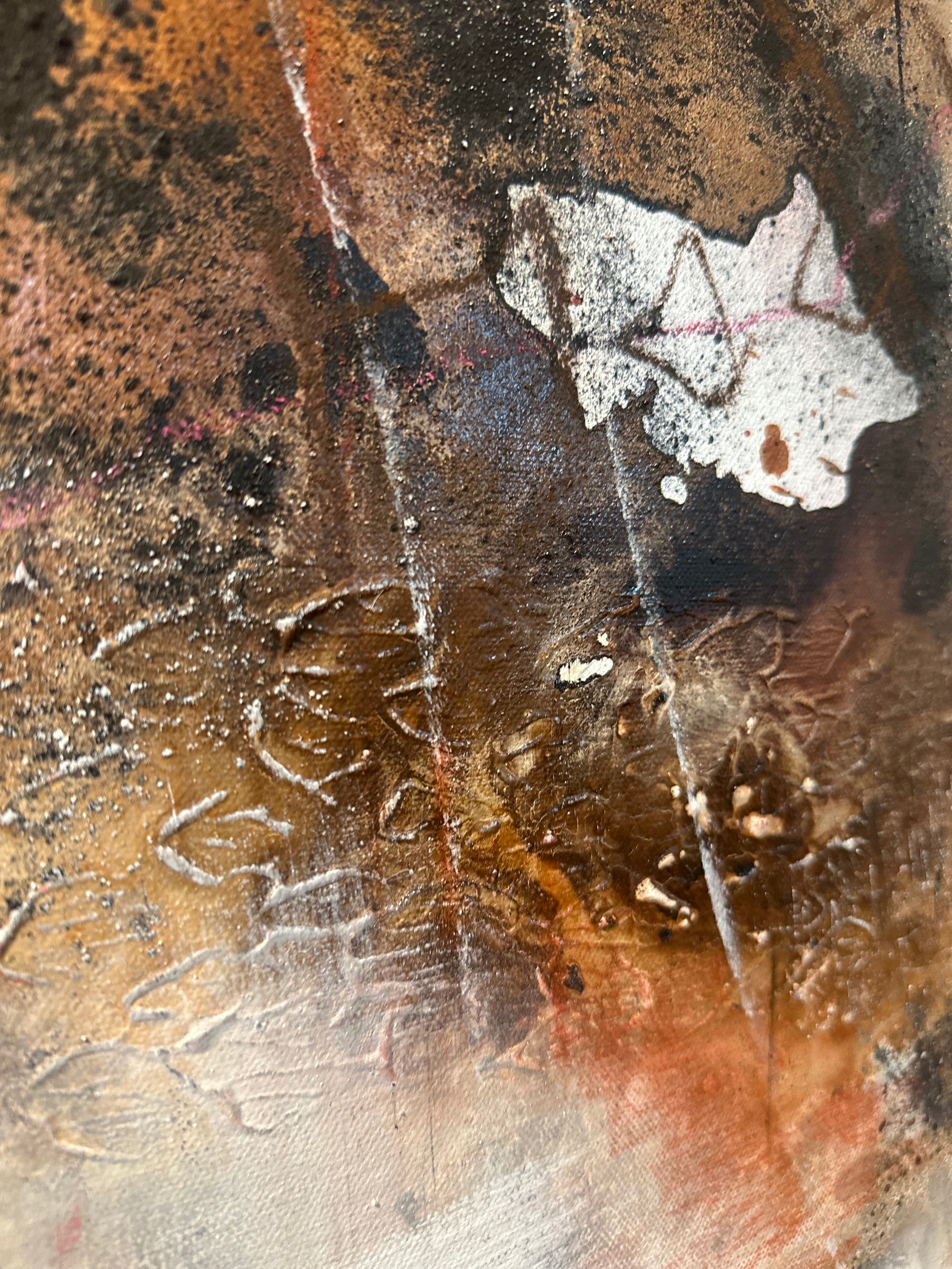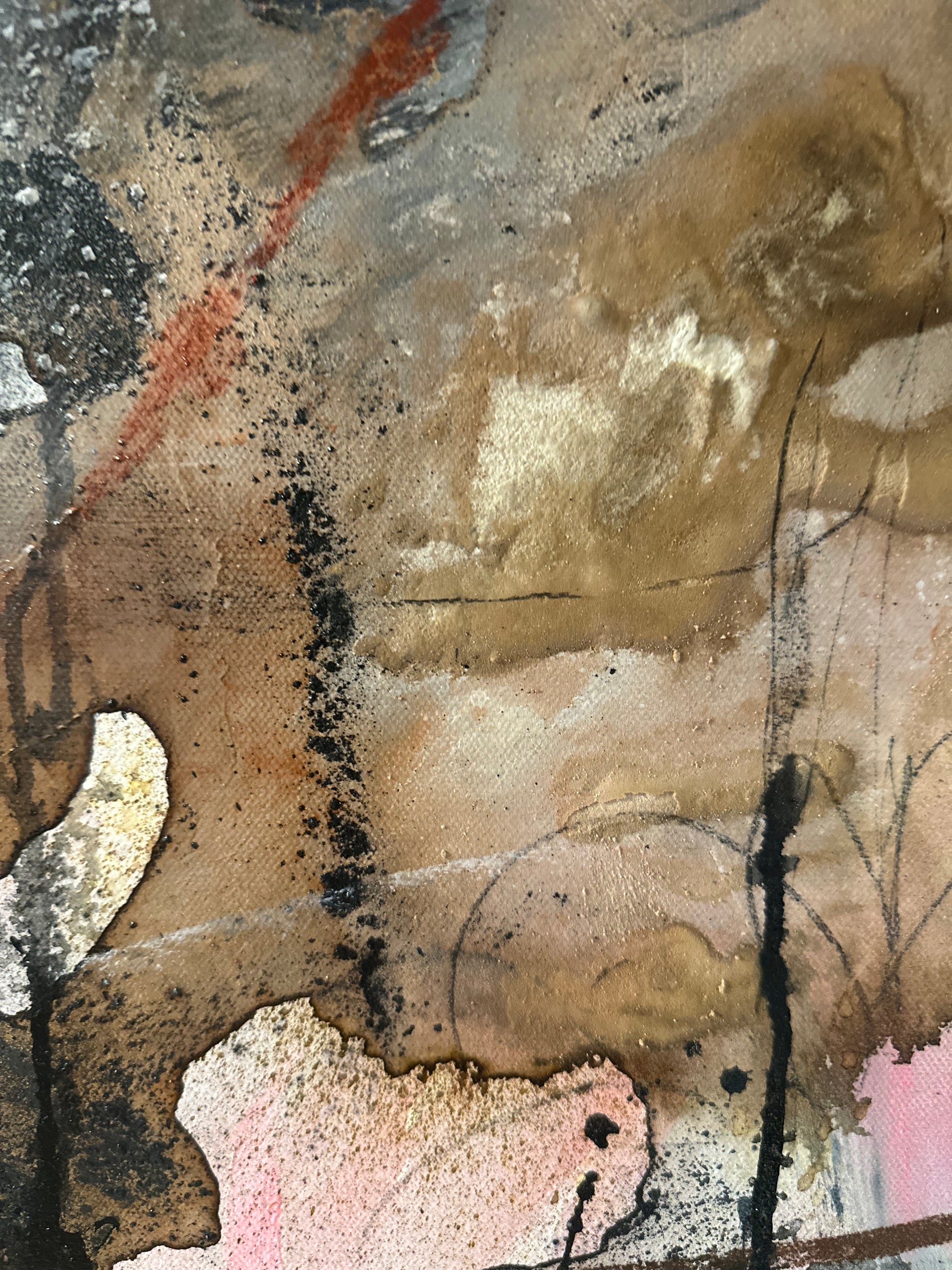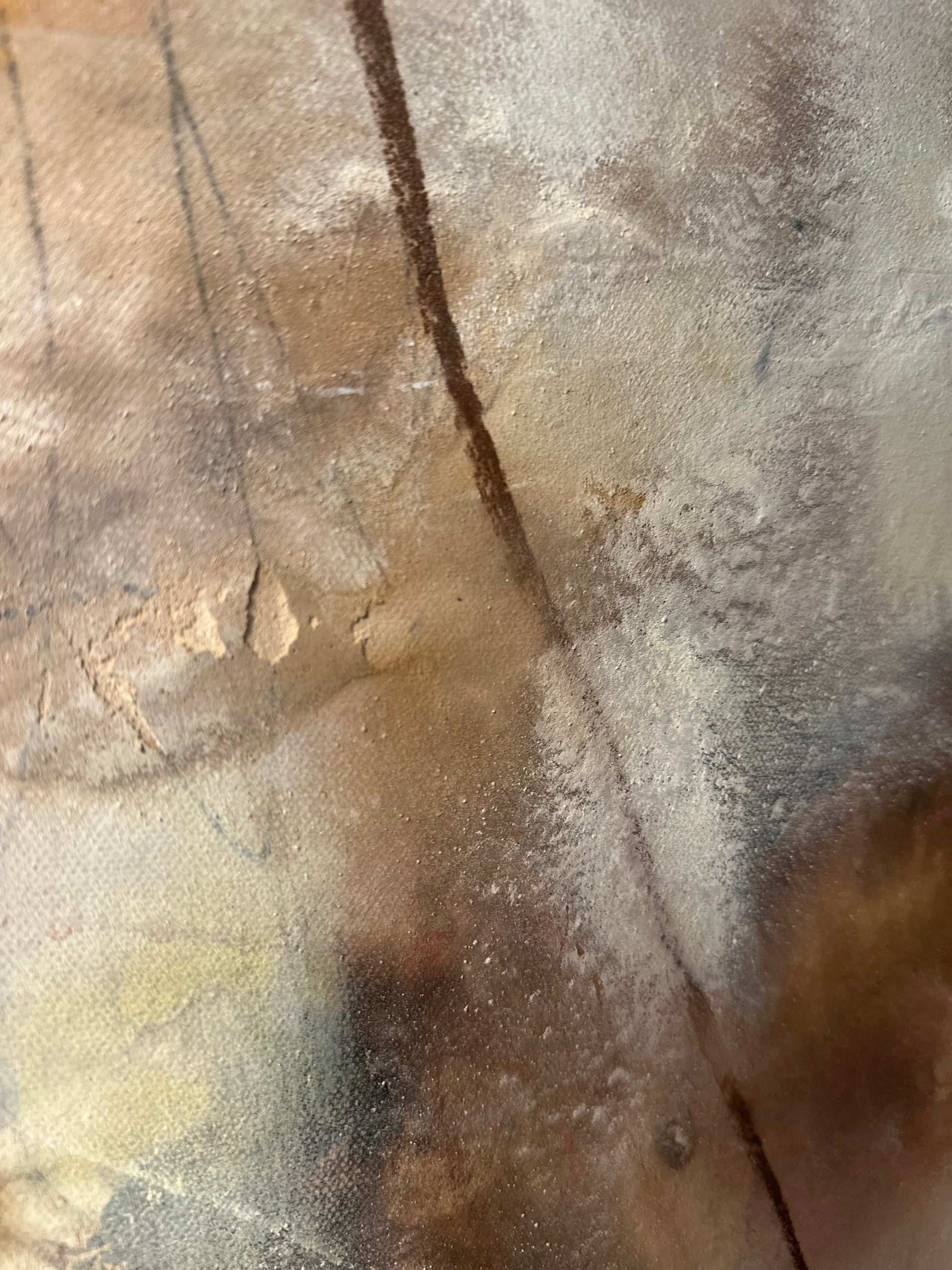 Et abstrakt originalmaleri som utforsker det usynlige som bærer oss. Minner, erfaringer, stillhet, styrke og sårbarhet. Lag på lag med akryl, kull, pasteller og sand skaper en taktil overflate med dybde og spenning, der det rå møter det myke. Et kraftfullt og stemningsfullt originalmaleri med rå tekstur og et moderne abstrakt uttrykk. Verket er bygget opp i lag med akryl, kull, pasteller og sand, som gir overflaten dybde, kontrast og liv. De jordnære tonene kombinert med lysere partier og markerte detaljer skaper et spennende og sanselig helhetsinntrykk.
