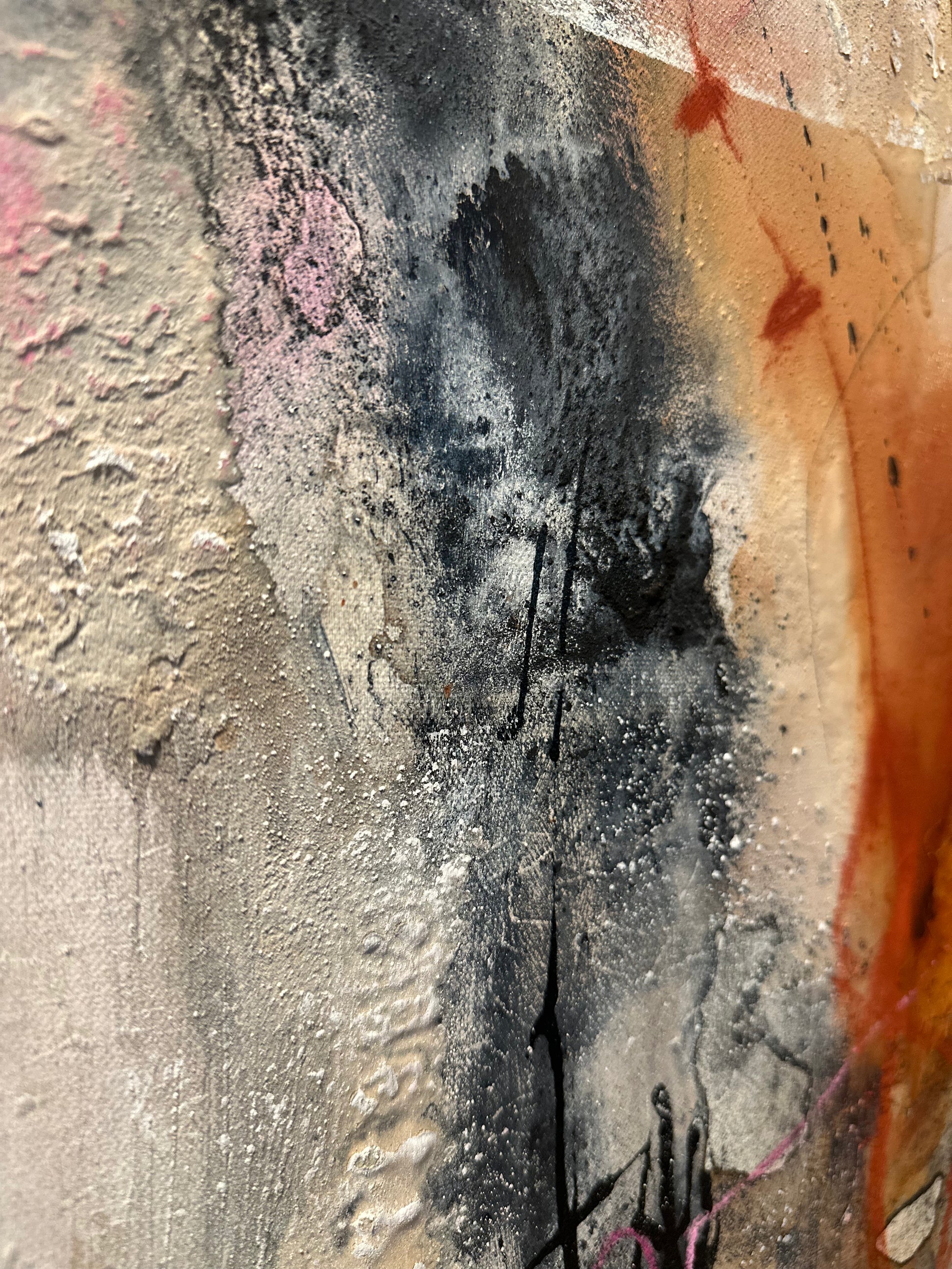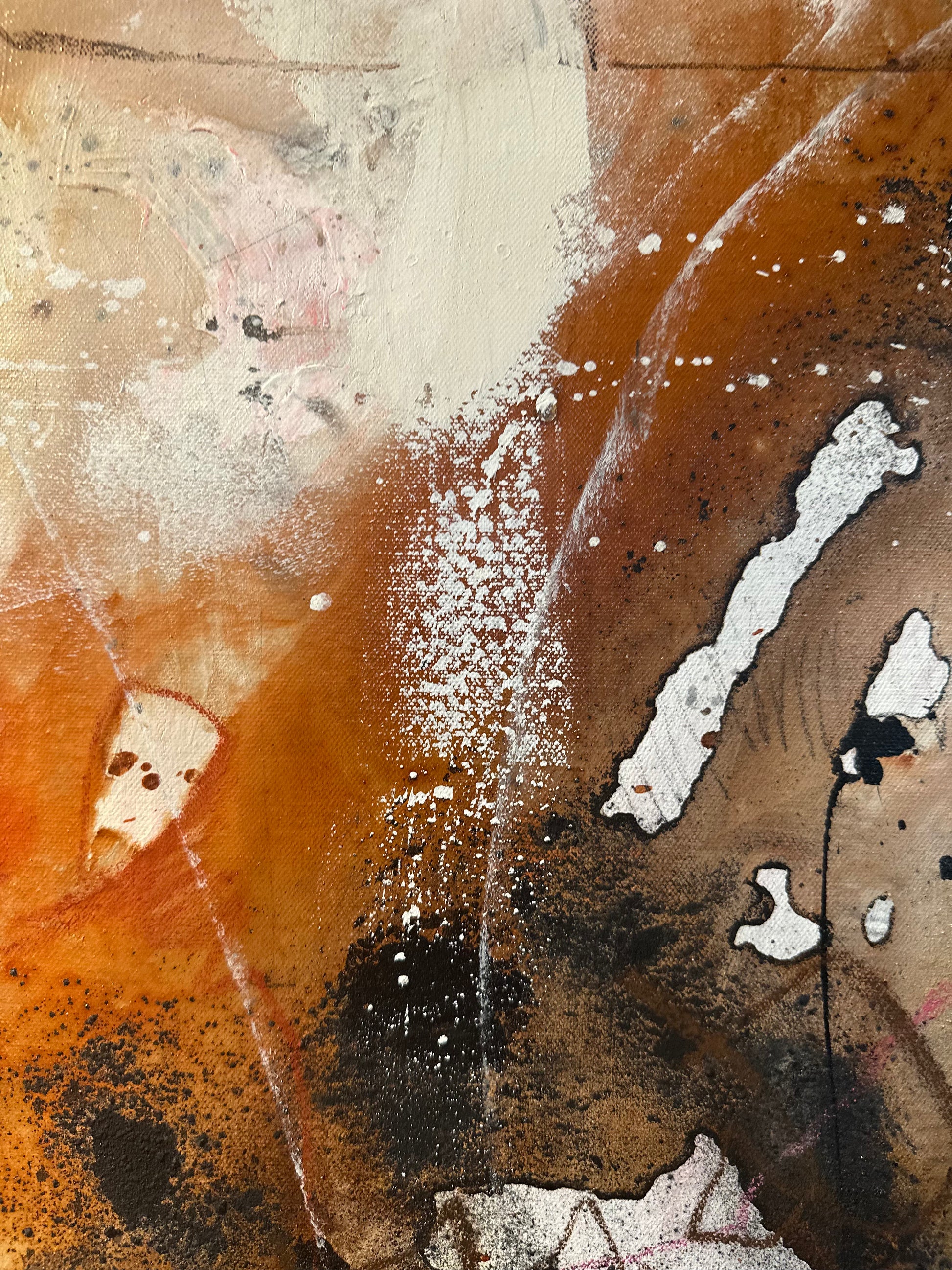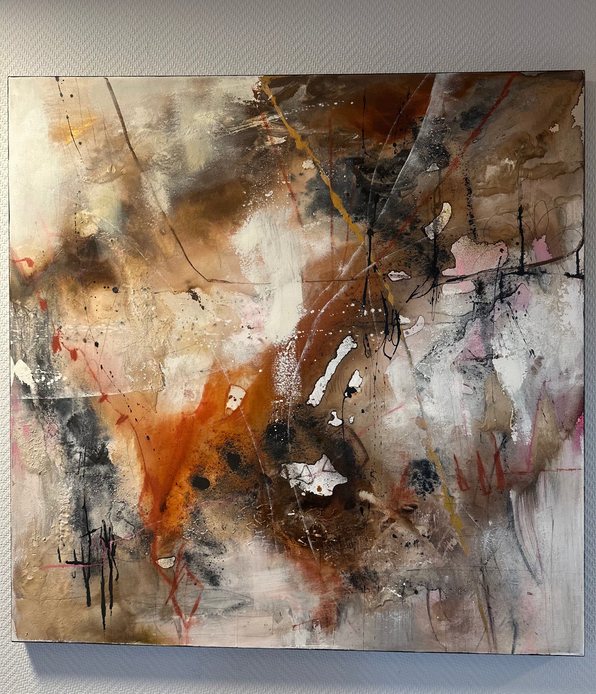 Et abstrakt originalmaleri som utforsker det usynlige som bærer oss. Minner, erfaringer, stillhet, styrke og sårbarhet. Lag på lag med akryl, kull, pasteller og sand skaper en taktil overflate med dybde og spenning, der det rå møter det myke. Et kraftfullt og stemningsfullt originalmaleri med rå tekstur og et moderne abstrakt uttrykk. Verket er bygget opp i lag med akryl, kull, pasteller og sand, som gir overflaten dybde, kontrast og liv. De jordnære tonene kombinert med lysere partier og markerte detaljer skaper et spennende og sanselig helhetsinntrykk.